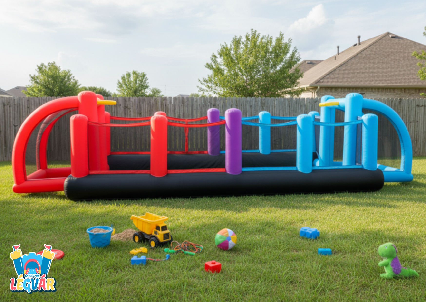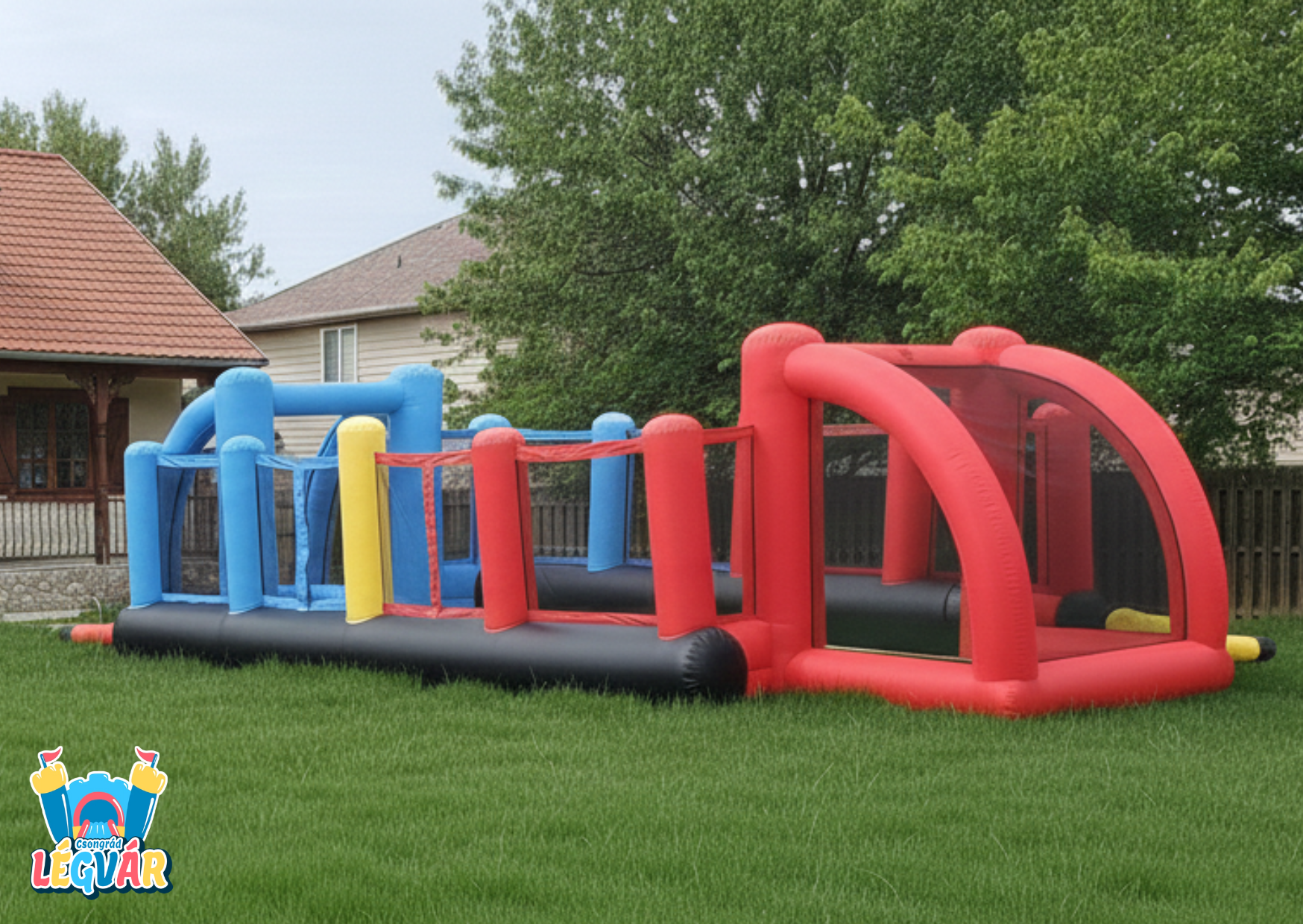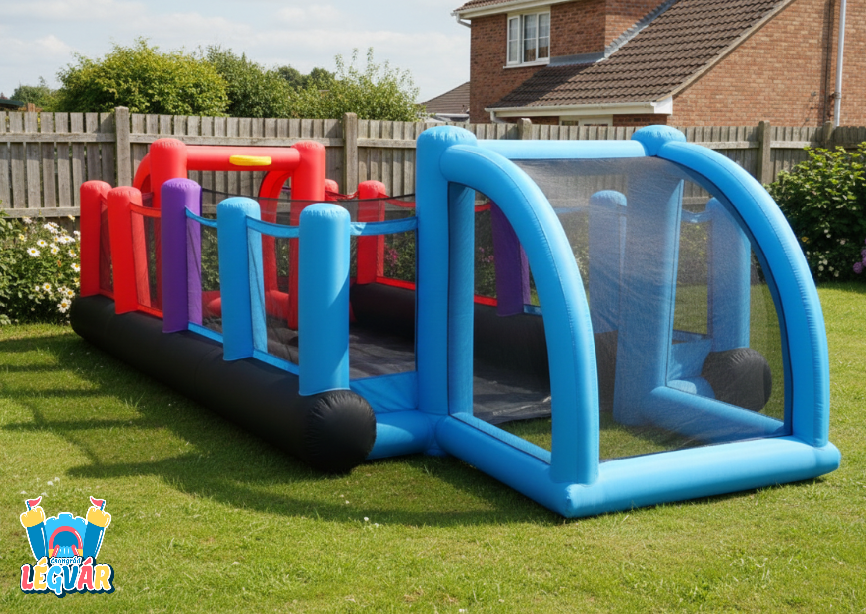 Csomag tartalma: légvár + befúvó motor + szállító táska + rögzítő cövekek
